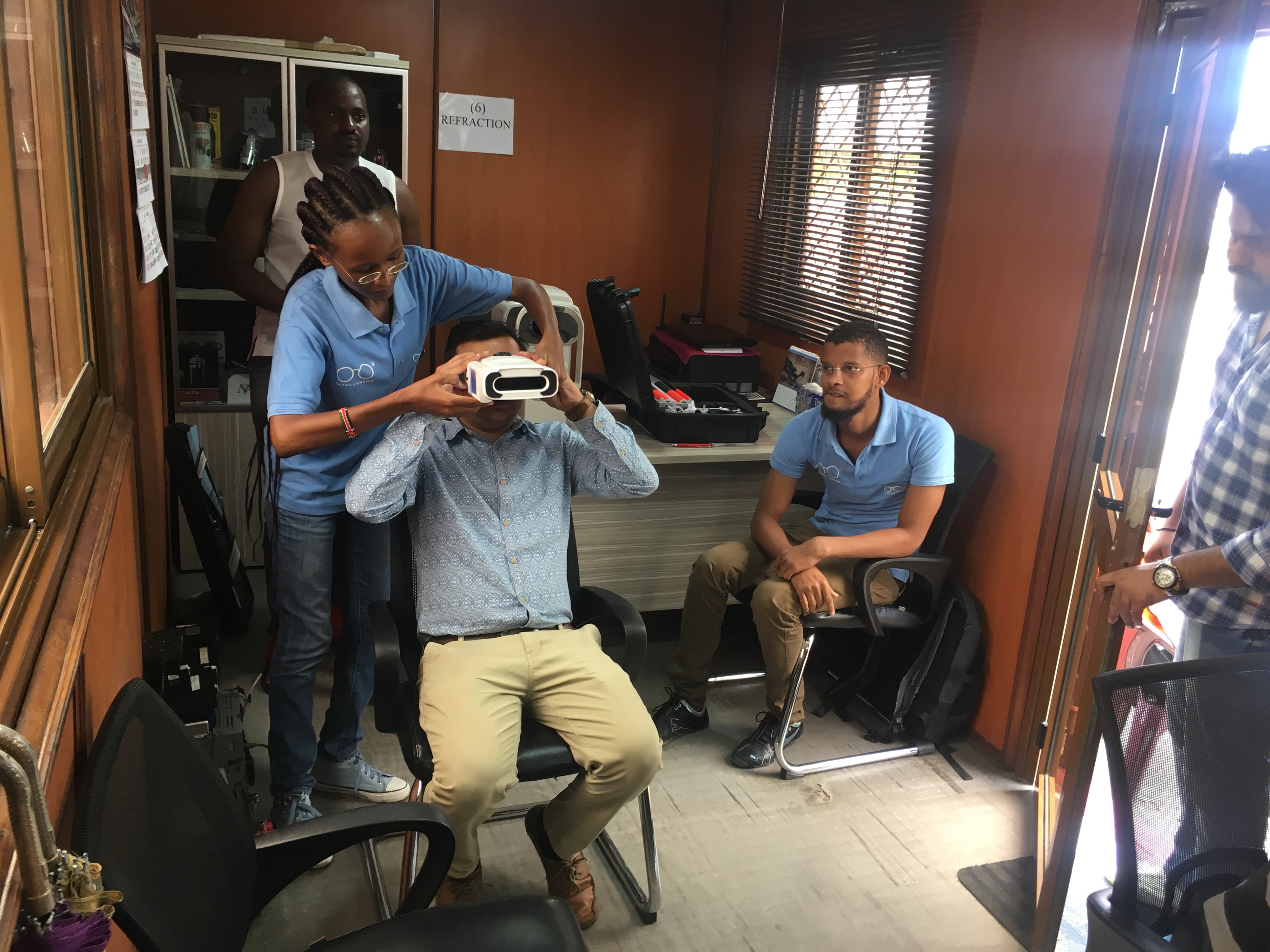 "Vision Vijana" a Kenyan startup, developed a mobile eye testing kit together with on-the-spot prescription glass assembly. This kit, the size of two suitcases, enables trained mobile opticians to test people's eyesight and provide them with the right glasses right away.